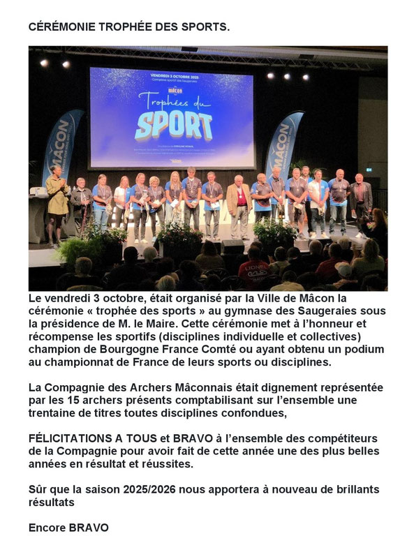 - Dimanche 12 octobre : concours 2x18 à la Compagnie (2 départs) ET réunion de la ronde de Bourgogne des chavaliers d'arc
